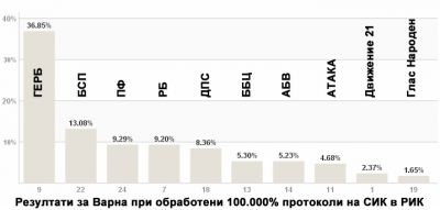 Последни резултати от гласуването във Варненска област на база 100% от обработените протоколите за парламентарните избори на 5 октомври.