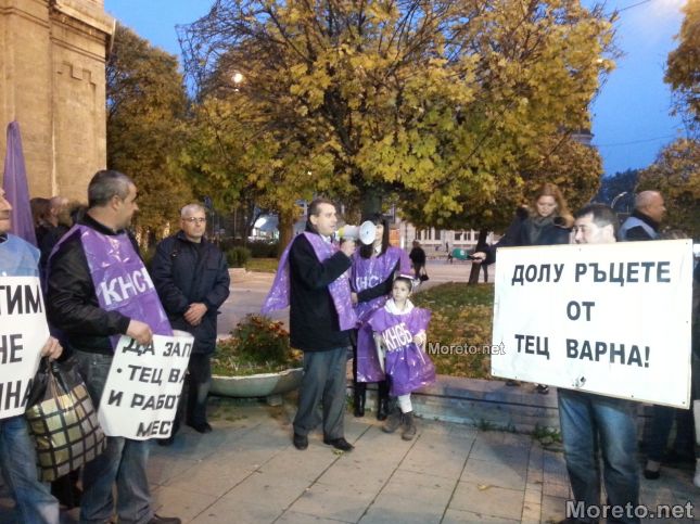 Над 70 служители на ТЕЦ-Варна се събраха на протест пред Катедралата срещу планираното закриване на електроцентралата от 1-ви януари 2015 от собственика ЧЕЗ-България. Проявата протече под организацията на синдикалните организации КТ „Подкрепа“ и КНСБ, предаде репортер на Moreto.net.