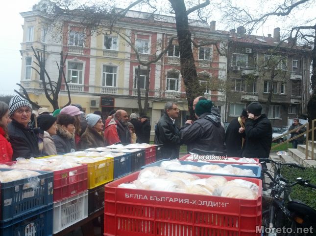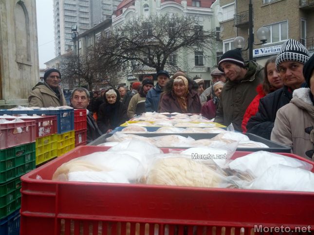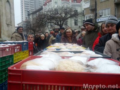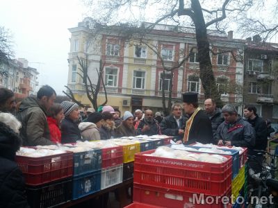 След празничната литургия, пред църквата "Свети Николай Чудотворец" миряни от епархията раздадоха на събралото се множество по питка хляб и пържена риба.