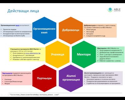 ABLE Mentor е програма, която цели повишаване мотивацията на учениците и развиване на потенциала им. Проектът е разработен от Асоциацията на българските лидери и предприемачи (ABLE) и е изцяло на доброволен принцип. ABLE Mentor създава менторски взаимоотношения между студенти и млади професионалисти с ученици от 10 или 11 клас., които работят заедно по проект в продължение на 4 месеца и споделят идеи, впечатления, решават предизвикателства заедно, за да превъзмогнат липсата на практическа насоченост в образованието. Участието в програмата е безплатно, съобщиха организаторите за Moreto.net.