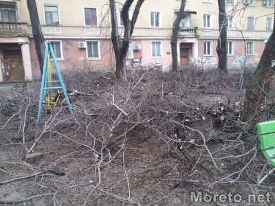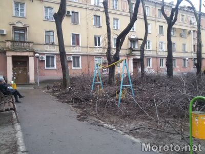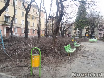 Дни след санитарна резитба на дървета в градинката зад цветното пазарче на "Чаталджа" във Варна, никой не прибира отрязаните клони. Вместо да се погрижат за почистване на мястото, от общината са оставили огромното количество дървесина, непосредствено до детски люлки и пързалка, жалват се живеещи в района пред Moreto.net.
