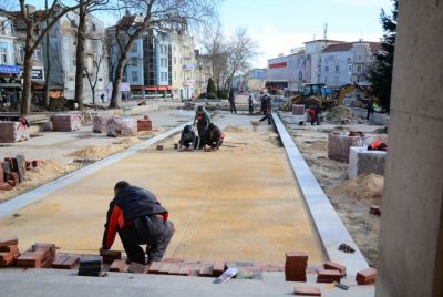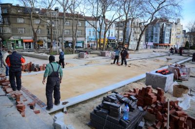 Работниците поставят новите клинкерни и мраморни павета в участъците пред Окръжния съд. Излети са основите на първия кръг на новия шадраван, изгражда се вторият. Поставени са линейните отводнители за дъждовна канализация, полага се капково напояване в зелените площи. В участъка пред „Валентина“ е готова подземната ел.инсталация.