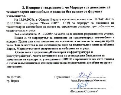 Във връзка с публикуваната статия за уволнени от Кирил Йорданов чиновници за разрушаването на "Картофена къща" , в редакцията на Moreto.net пристигна писмо "Право на отговор" от инж. Красимира Михнева - гл.експерт и Веселина Стоянова - гл.специалист към "Комуникации и безопасност на движението" в отдел "Пътна инфраструктура към Дирекция "ИИБ при Община Варна. В писмото се съобщава, че за административните санкции спрямо тях, са научили от пресата без предварително някой от общинската администрация да е изисквал от тях обяснения и сведения, за обстоятелствата и причините, поради които са одобрени документите. В писмото се казва, че е невярно твърдението, че План за безопасност и здраве е одобрен преди подаването на искане от собственика на сградата. Също така за невярно твърдение е посочено, че Маршрутът за движение на тежкотоварни автомобили е издаден без искане от фирмата изпълнител.