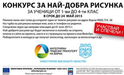Как би изглеждала Варна на две колела? Кои са любимите ти места за каране на велосипед? Докъде можеш да стигнеш с колело? Нека детето ти нарисува себе си, своето семейство, приятелите си! Нека създаде с молив или четка най-веселите велосипедни картини! Изпрати ни ги и то може да получи големи награди - велосипеди и екипировка за колоездене! Конкурсът за детска рисунка е в две категории - за учениците от 1 до 4 и от 5 до 7 клас. Всеки желаещ може да изпрати рисунка на адрес Варна, Централна поща, п.к. ХХХ. Срокът е до 24.05. 2015 г. Специално жури ще обяви 3-ма победителите във всяка от 2-те категориите. Най-добрите рисунки ще бъдат включени в изложба.