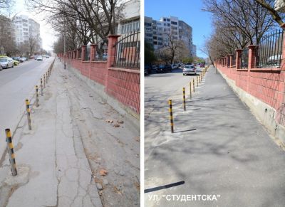 Общо 431 кв. м. тротоарни площи са ремонтирани покрай Математическата гимназия, поставени са 157 антипаркинг колчета. По протежението на ул. „Студентска“ до Технически университет са рехабилитирани 1364 кв. м. тротоари, поставени са 73 бр. колчета.