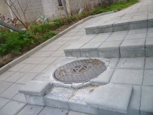 Както се вижда на снимките, има остатъци от цимент, но явно при първите дъждове той се е оказал непосилен в задачата си да задържи плочките. Така че, ако ви се наложи да минете по тях, има възможност да паднете. И по трите стъпала, които явно е трябвало да се ремонтират, е опасно да стъпвате. В случай че ги разместите, за да не ви стане неудобно, че сте разрушили част от градската инфраструктура, може да ги наредите обратно, както е направил авторът на снимките.