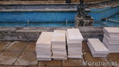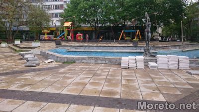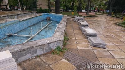 Около съоръжението мраморните плочи, които вече са свалени и са част от старата визия на фонтаните. До тях са разположени и купчини с новите плочки, които предстои да бъдат поставени.