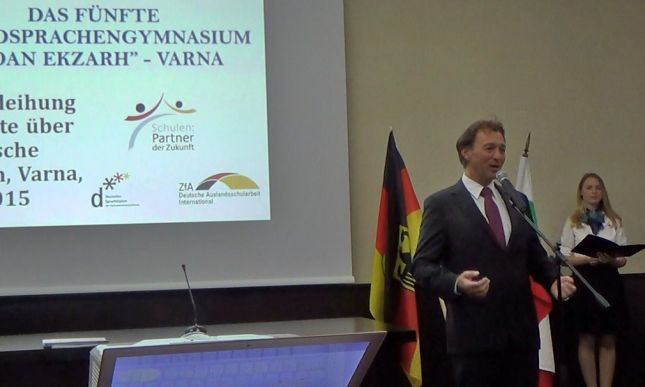 На официална церемония 17 абитуриенти на ГПЧЕ "Йоан Екзарх" - Варна получиха своите немски езикови дипломи лично от ръководителя на отдел "Култура и връзки с медиите" Немско посолсво – София, г-н Маркус Хаас, съобщиха от учебното заведение за Moreto.net.