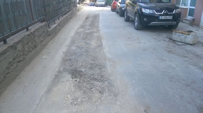 А днес нарязаха нови 15-тина метра, вероятно за прекарване на канализация. Ясно ви е последващото асфалтиране на изрязаният участък върху пръст пръст (вижда се от снимката) с каква трайност ще е. Кога най-накрая строителите ще бъдат заставени да възстановяват участъци по цялата дължина на увредената от тях улица, а не само на повредените от тях парцели. И защо напук на усилията на Общината, една фирма опропастява цяла улица.