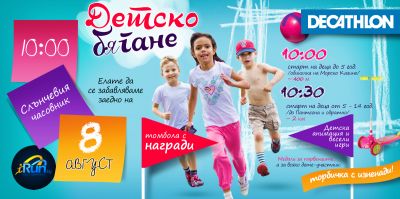 "Декатлон" Варна и iRun канят всички деца, които могат да се впуснат в това приключение без помощта на родителите си, да се включат в детското бягане тази събота (8 август) в 10:00 на Слънчевия часовник под ФКЦ. Всеки от малките участници ще получи свой личен стартов номер, с който в края на бягането ще може да си вземе торбичка с подарък и грамота.
