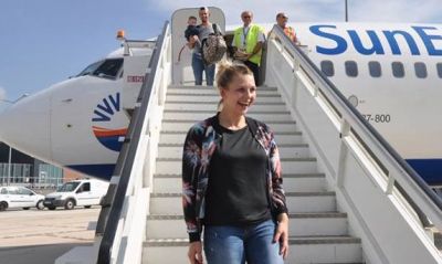 Нина Егелер кацна с полет от Щутгарт. Пътничката пристигна във Варна със съпруга си и 16 месечният им син Лио. Семейството идва за втори път в България, защото страната много им харесва. Много благодаря на варненци за това приятно посрещане, каза Нина.