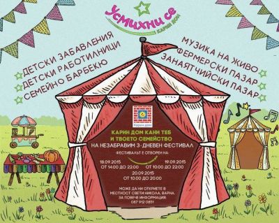 Благотворителен фестивал "Усмихни се" ще бъде открит днес в Карин дом във Варна. Фестивалът ще се състои в рамките на три дни от днес 18-ти до 20-ти септември включително в слънчевата градина на Карин дом в местност Свети Никола Морската градина.