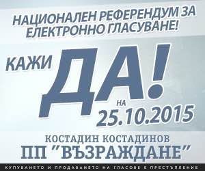 На 25.10.2015 г., паралелно с изборите за общински съветници и кметове, ще се проведе национален референдум. Поставеният въпрос е – „Подкрепяте ли да може да се гласува и дистанционно по електронен път при произвеждане на изборите и референдумите?“ Гласоподавателите ще имат възможност да изберат един от следните два отговора – „да“ или „не“. За нас от “Възраждане” правилният избор е положителният!