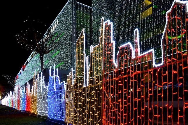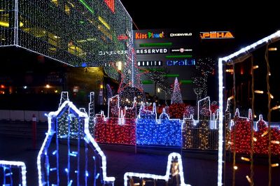 Тази година сградата е украсена с уникални светлинни завеси, които буквално опаковат в отблясъци мола.