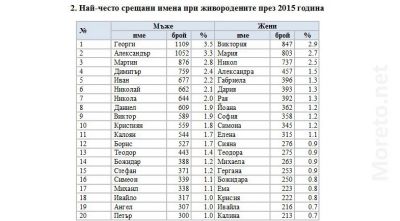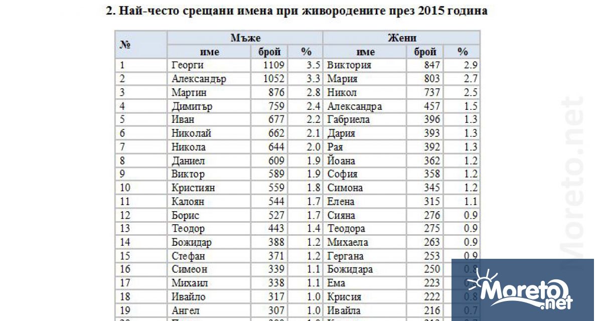 За родените през 2015 година най-разпространени са мъжките Георги и Александър, Виктория и Мария при женските имена