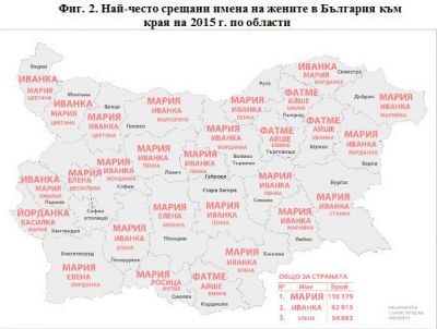 Най-често срещаното име сред жените за 2015 година в страната, продължава да е Мария - 118 хиляди. Следват Иванка - 62 хил., Елена - 54 хил., и Йорданка - 40 хиляди. Сред двадесетте най-популярни имена при жените следват Пенка - 32 хил., Даниела - 30 хил., Росица, Десислава, Петя, Марийка, Гергана и други.