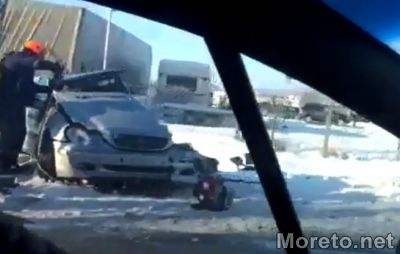 Автомобил мерцедес не спрял на знак "стоп", излязъл на пътя и бил буквално пометен от камион ивеко.
