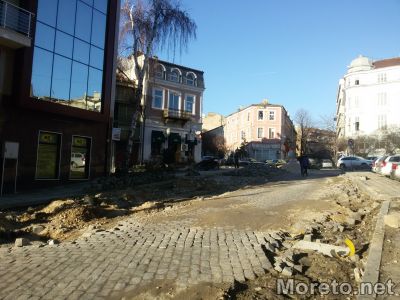 Вече месец и половина районът от площад „Независимост" до площад „Митрополит Симеон", стои с разкопани тротоари и разкопана пътна настилка. Част от старите павета по трасета, за които беше решено да бъдат възстановени, са наредени край тротоарите.