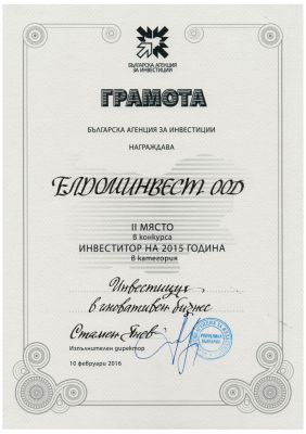 Елдоминвест ООД бе отличен с грамота в категория „Инвестиция в иновативен бизнес”