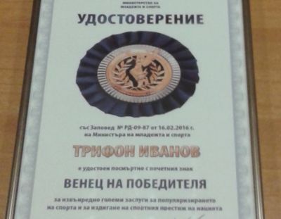 Трифон Иванов бе удостоен посмъртно с почетния знак на Министерството на младежта и спорта „Венец на победителя“, съобщиха оттам за Moreto.net.