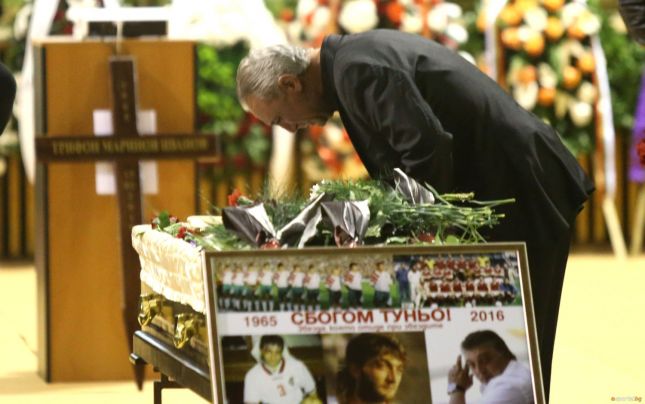 Първи пред легендата на родния футбол се поклониха кметът Даниел Панов и неговото семейство, а след това съотборниците и приятелите на Туньо. Неутешим бе Христо Стоичков, който изключително трудно се раздели с един от най-близките си приятели.