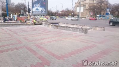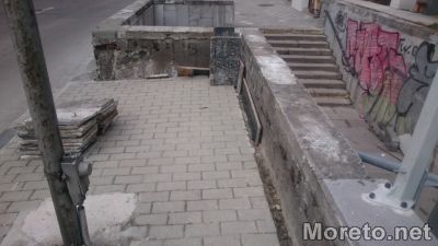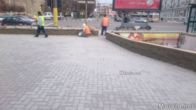 Изпочупените плочи от облицовката на надземната част на подлезите, които силно контрастираха с вече обновените тротоари, са изцяло отстранени. Работници старателно измазват и подготвят свободната повърхност за новото покритие.