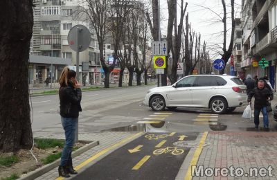 Въпреки няколкото забранителни знаци и табели, шофьори редовно спират върху пешеходната пътека и новата велоалея на пресечката на ул. „Македония" и бул. „Осми Приморски полк" във Варна. Поредният случай е от днес, сигнализират читатели на Moreto.net.