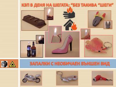 В каталога на опасните „шеговити” стоки намират място и т.нар. „запалки с необичаен външен вид”. Те пък изненадват с изскачащ от най-неочаквани места пламък. Натискането на задната гума на мотор-запалка, например, задейства механизма за запалване и от „мястото на шофьора” изниква пламък. „Ефектът” от това може да е изгаряне и дори пожар.