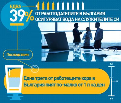 Eдва 39% от работодателите в България осигуряват вода на служителите си. Това показват резултатите от национално проучване, проведено през април 2016г. от Българската асоциация за управление на хора и Алфа Рисърч сред работещите в страната, научи Moreto.net.