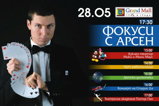 Два празнични дни, пълни с вълшебства, игри, мода и театър, подарява Grand Mall на малките и пораснали малчугани за Деня на детето. На 28 май от 17.30 ч. младият маг Арсен ще зарадва публиката със сръчност и изобретателност, а на 1 юни Бате Ицо пак от 17.30 ч. ще омае зрителите със своите приказки, разказани с много хумор и фантазия. Още изненади с театър, мода и музика ще има за малките госпожици и господа през двата вълшебни дни в най-големия търговски център във Варна.