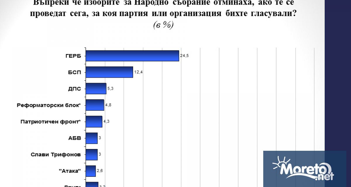 Близо 25% заявяват, че биха гласували за ГЕРБ, ако изборите се провеждаха сега, а над 12% - за БСП. Над 5% обявяват, че ще гласуват за ДПС, близо 5% - за партиите на Реформаторския блок, а над 4% - за партиите на Патриотичния фронт. 3% са готови да гласуват за АБВ, а други 3% декларират, че биха гласували за формация на Слави Трифонов. Близо 3% е потенциалният електорат на „Атака", а 37% заявяват, че не биха гласували.