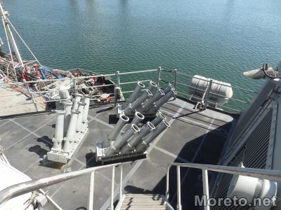 На борда на кораба има няколко оръдия, ракетни остановки, туби за торпеда, малки лодки, които могат да бъдат пуснати по всяко време на вода. Разполага още с хеликоптерна площадка. При кацане всички мрежи и антени се свалят и остава в ръцете на пилота да приземи безпроблемно летателната машина. Благодарение на специална антена екипажът има телевизия на борда. Съоръжение пък позволява зареждане на кораба с провизии, докато е в открито море и не налага влизане в пристанище.