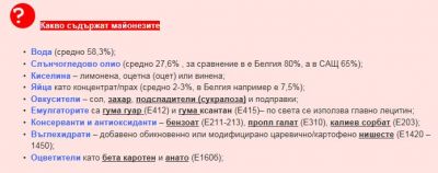 "Използваните в България рецептури не отговарят на нито един от международно утвърдените стандарти за майонеза. Майонезите са подложени на съществена “иновация” от повечето производители. В тях значително е намалено съдържанието на растително масло. Липсата му е компенсирана с добавяне най-вече на много вода. Друга характерна особеност на родните продукти е озахаряването. За да добие плътност и форма в майонезите са добавяни големи количества въглехидрати под формата на нишесте и технологичните добавки гума гуар и гума касантан. По същество повечето търговски марки майонеза представляват водно-нишестена емулсия с добавено растително масло, киселина и подправки, а понякога и яйца. Анализът на влаганите мазнини показва по-оптимистични резултати. Не се потвърдиха предварителните опасения за влагане на индустриални мазнини. При всички 16 марки като суровина е ползвано слънчогледово олио."