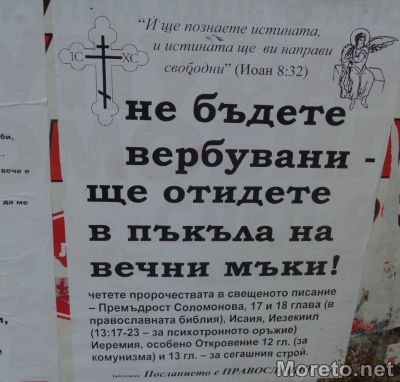 На броени метри от школски дворове, десетки деца и младежи могат да прочетат листовки със странни послания, едно от които гласи: "Не бъдете вербувани, ще отидете в пъкъла на вечни мъки!". Част от афишите съдържат цитати от библията, други пък – рефрени от песни на популярни сред тийнейджърите изпълнители като Криско, Павел и Венци Венц. Освен цитатите, на някои от плакатите има и черно-бели сатанински изображения.