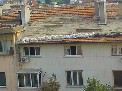 Тя изпрати и снимки, на които се вижда, че се извършва ремонт на сграда по булевард "Сливница", а чували с отпадъци застрашително стоят по ръбовете на покрива.