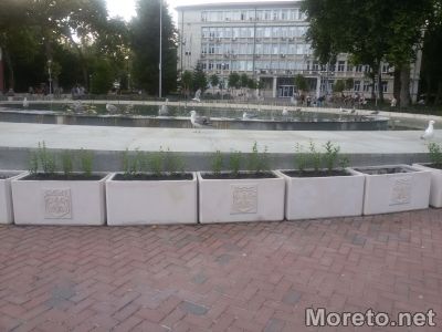 95 декоративни саксии с герба на Варна очертаха зелена ограда около фонтана на площад "Независимост", видя репортер на Moreto.net.