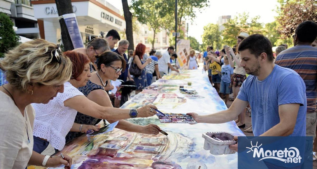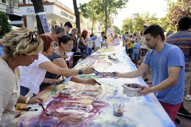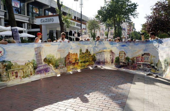 В централната част на града в пешеходната част пред хотел „Черно море“ имахме възможност да станем свидетели на живописно изпълнение на 10 метрова картина с акварел, едновременно от 16 художници, изобразяваща емблематични сгради за град Варна.