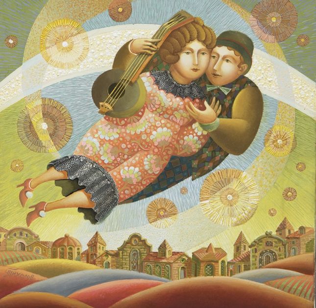 От днес до 5 октомври, с топлите есенни лъчи, ще ви очароват поезията и светлината в красиви градски пейзажи и замечтани ведри хора, изобразени с умела фина четка и в хармонията на добрата живопис. Художниците смело навлизат във взаимоотношенията на хората в цветни градски и интимни пространства и нрави, като че ли са герои от отминало време, запечатано в лирично четиристишие. Всеки от двамата творци, с различен поглед и философия за живота, но и обединени от любовта към романтиката и цветността, с лекота разказват историите на Тя и Той в прекрасни детайлни картини. Различни в изразността си и едновременно допълващи се, и двамата са вдъхновени от идеализма и романтиката в човешкия път. Той е влюбен в града и градските истории, в уличните музиканти, в светлините от панаира, на градските улици и сгради, на нежната прегръдка и приказния летеж на мечтите. Тя – разплитаща тайните на хората и оплитаща разкази на нежната човешка природа, като умело използва множество детайли и вещи, цветни акценти и шарки, които улавят решително вниманието на зрителя. От творбите и на двамата струи мелодичността и хармонията на колорита и плавната линия, с препратки към уютен италиански град от началото на миналия век.
