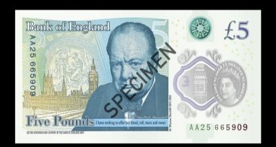Новото платежно средство е с номинал 5 паунда, а върху него е изобразен лика министър-председателя на Великобритания от времето на Втората световна война Уинстън Чърчил. Освен това върху банкнотата е изписана знаменитата фраза на политика: „Не мога да предложа нищо друго освен кръв, тежък труд, сълзи и пот”.