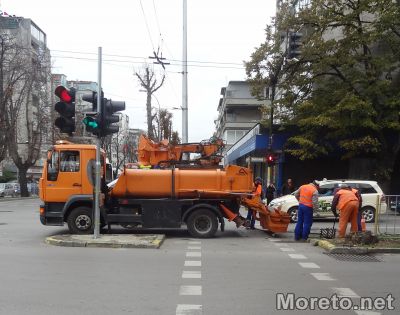 Днес работници със специализирана техника отпушваха задръстените канали в района на „Червения площад". Тъй като машината беше разположена в пътното платно насред едно от най-натоварените кръстовища в града, от светофара с „Генерал Колев" до „Орбита" се образуваха колони от автомобили.