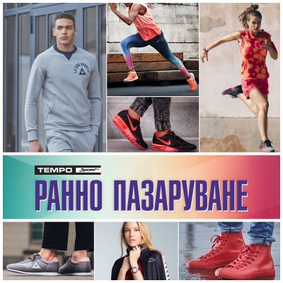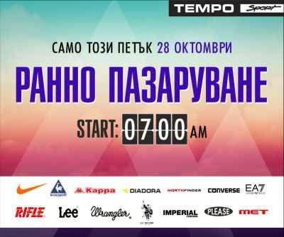 Този петък, 28 октомври е денят на известното Ранно пазаруване в магазини Tempo Sport & Casual, научи Moreto.net. Всички артикули на световните марки, които предлага веригата, ще бъдат намалени и колкото по-рано пазаруват клиентите, толкова по-голяма отстъпка ще получат от етикетната цена.
