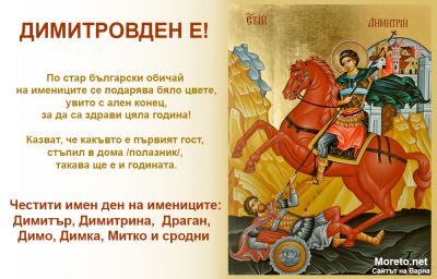 Свети Димитър е един от любимите светци на българина. На празника, който се чества на 26 октомври имен ден имат всички носещи неговото име: Димитър, Димитрина, Драган, Димо, Димка, Митко, Митре и сродни. Най-често свети Димитър е изобразен на кон, убиващ Лий – символ на неверника антихрист
