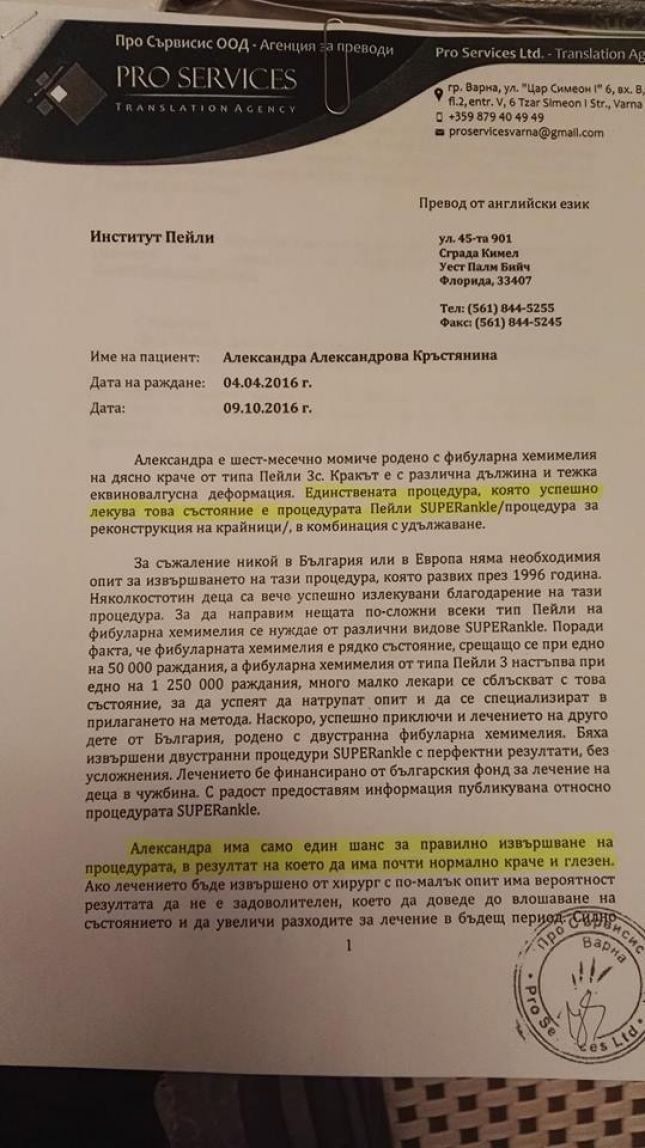 Родителите на детето разпространиха съобщение във фейсбук, че американски лекар е готов да извърши операции на Алекс, с чиято помощ варненчето ще може да ходи нормално.