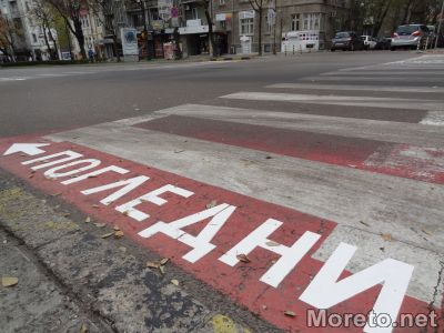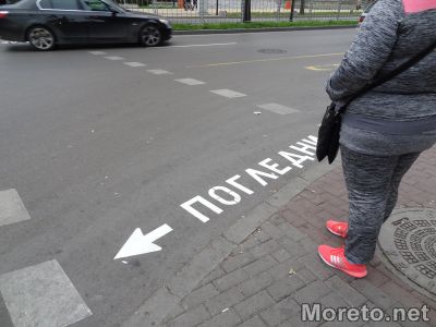 Огромни надписи „Погледни" и стрелки, сочещи наляво или надясно според движението на автомобилите, бяха положени върху пешеходните пътеки в района на Община Варна, видя репортер на Moreto.net.