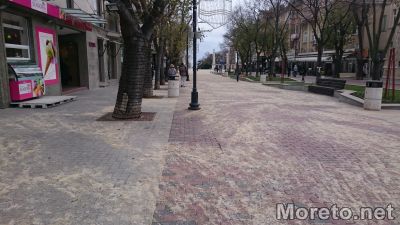 Уплътняване на фугите между паветата по пешеходната от „Севастопол" до Морската градина тече днес, видя репортер на Moreto.net.