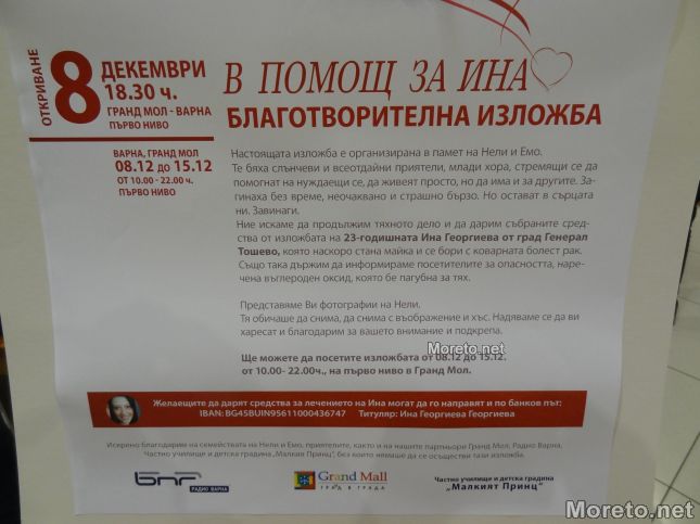 Изложбата „от Нели и Емо" може да бъде посетена всеки ден между 10 и 22 часа на първо ниво в Гранд Мол Варна. Желаещите да дарят средства за лечението на Ина могат да го направят и на следната банкова сметка: