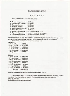 Събраните средства са преброени от 9 членна комисия и днес са внесени в сметката на Александра Кръстянина.