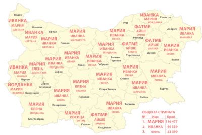 Според НСИ носещите името Георги в цялата страна са 166 017 души. Жените, казващи се Мария са 116 477. Според данните за цялата страна, през 2016-та година най-често родителите са избирали имената Александър и Виктория. При новородените през 2016-та се запазва тенденцията за по-голямо разнообразие при имената на момичетата. Други популярни са Виктор, Николай, Виктория, Никол, София и Мартин.