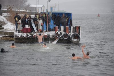 Общо 6 души се престрашиха да скочат в ледените води на Белославското езеро. Димитър Стоянов първи се добра до кръста.
