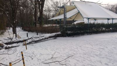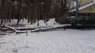 Огромните клони са запречили алеята до спортното игрище. Десетки сигнали за паднали дървета, ламарини, рекламни табла и мазилка вследствие на лошото време бяха подадени от граждани през изминалите дни. За късмет инцидентите се разминаха без пострадали.